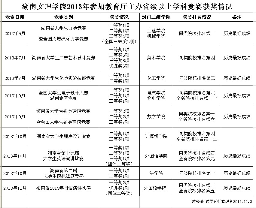 湖南文理学院2013年参加教育厅主办省级以上学科竞赛获奖情况